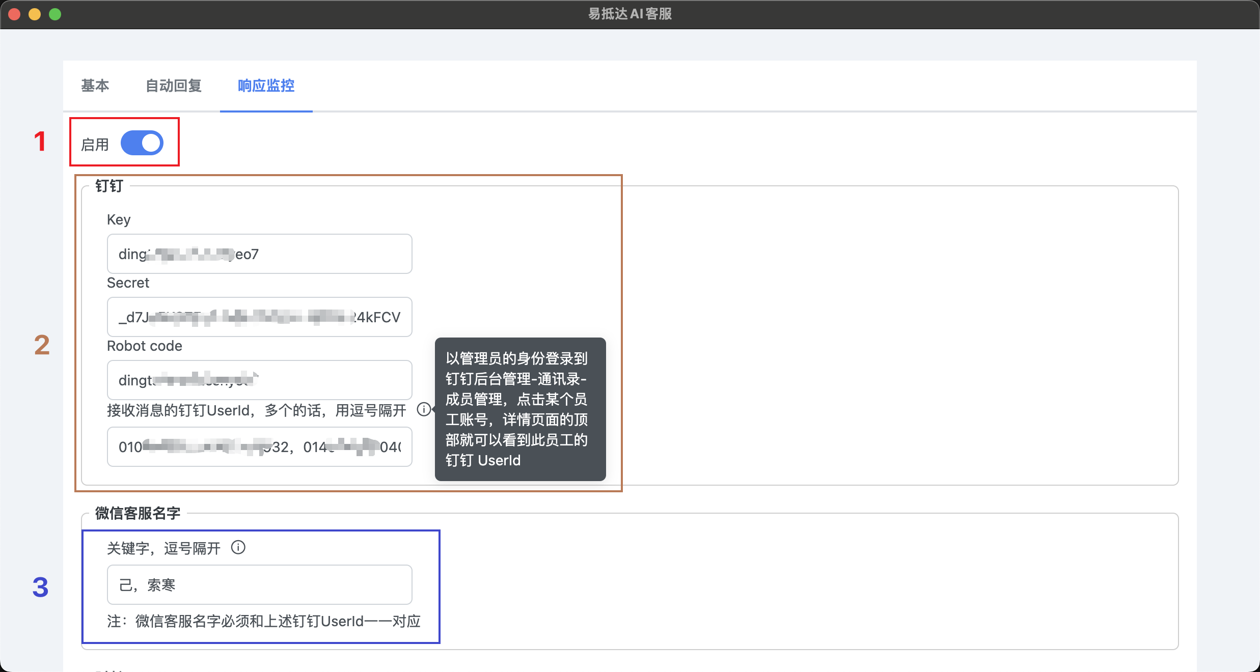 2、填写钉钉的配置信息Key、Secret、Robot,以及要将消息通知到钉钉用户的用户ID