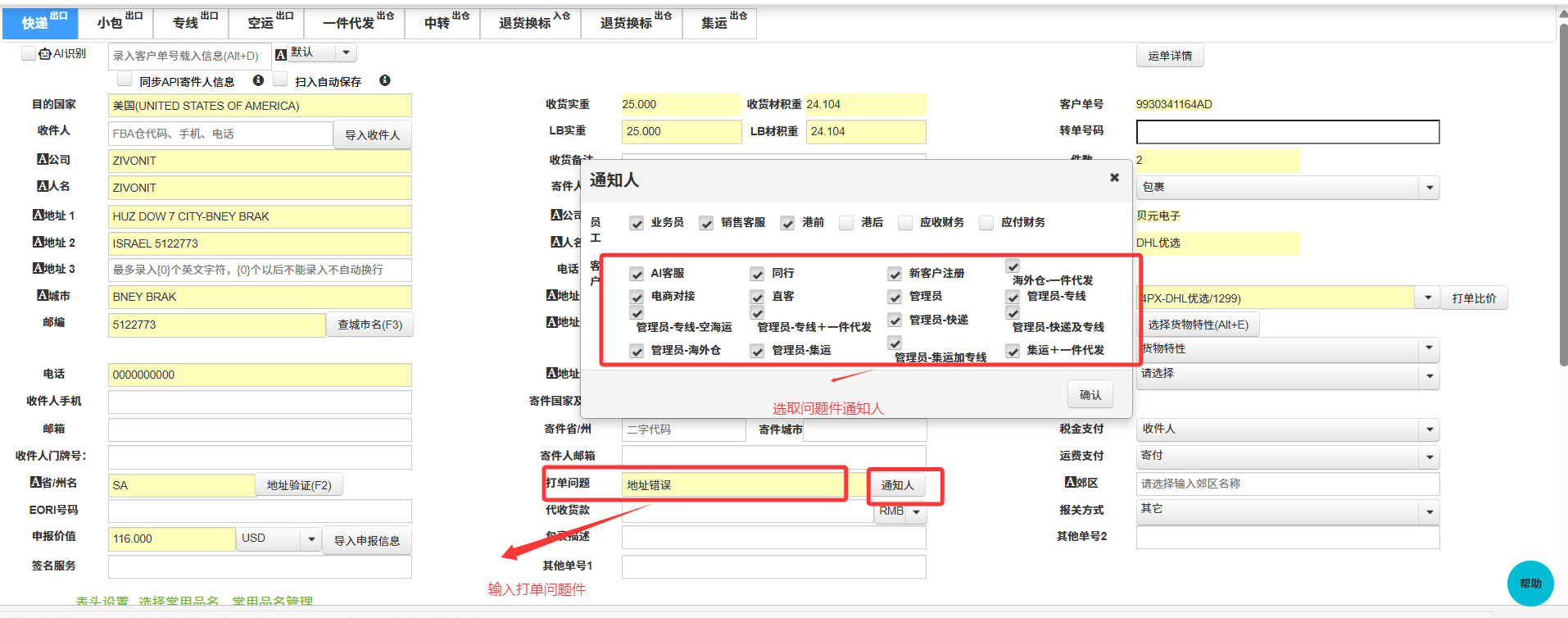 进入打单界面,在问题件录入区域填写异常内容(如 “地址错误:收件人门牌号缺失”)。