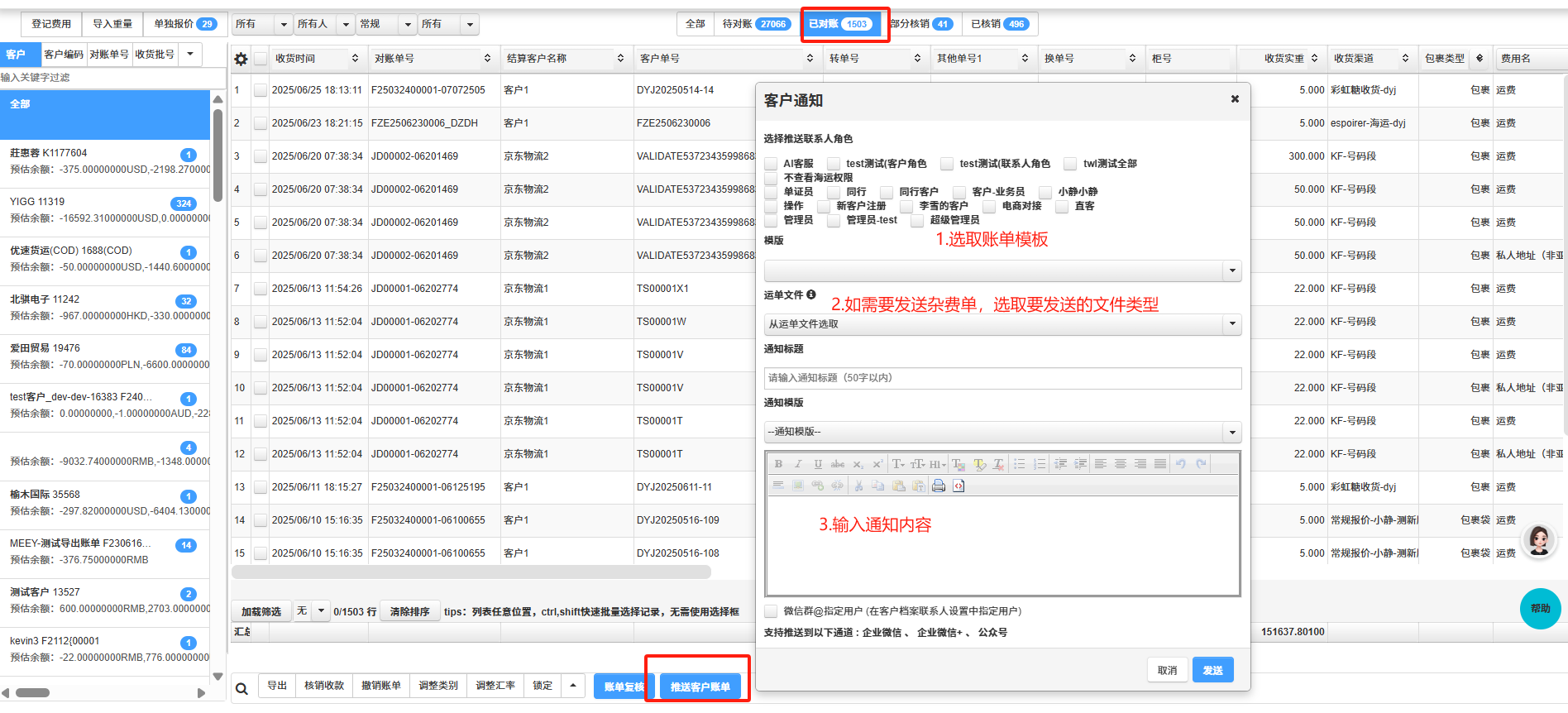 勾选需要发送账单的费用条目,点击 “推送客户账单” 按钮。